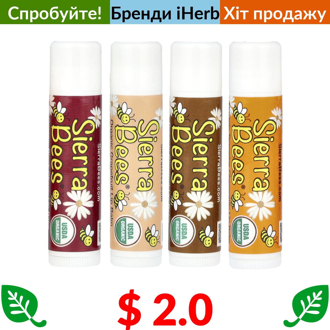 $ 2.0 Sierra Bees, набір органічних бальзамів для губ, 4 штуки по 4,25 г (0,15 унції)