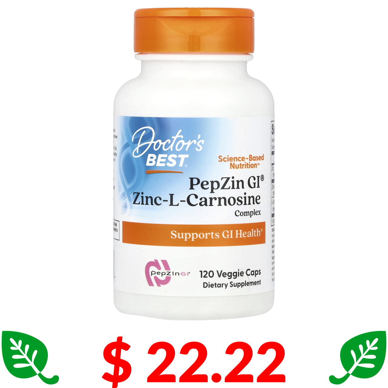 $ 22.22 Doctor's Best, PepZin GI®, комплекс цинк-L-карнозину, 120 веганських капсул