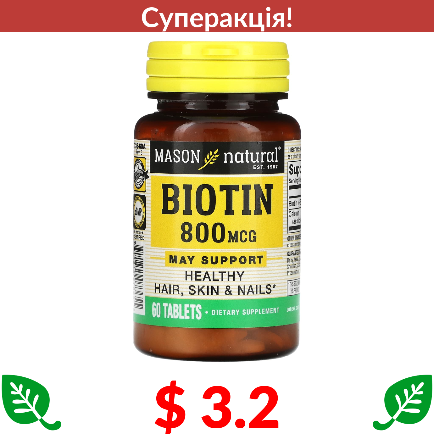 $ 3.2 Mason Natural, біотин, 800 мкг, 60 таблеток