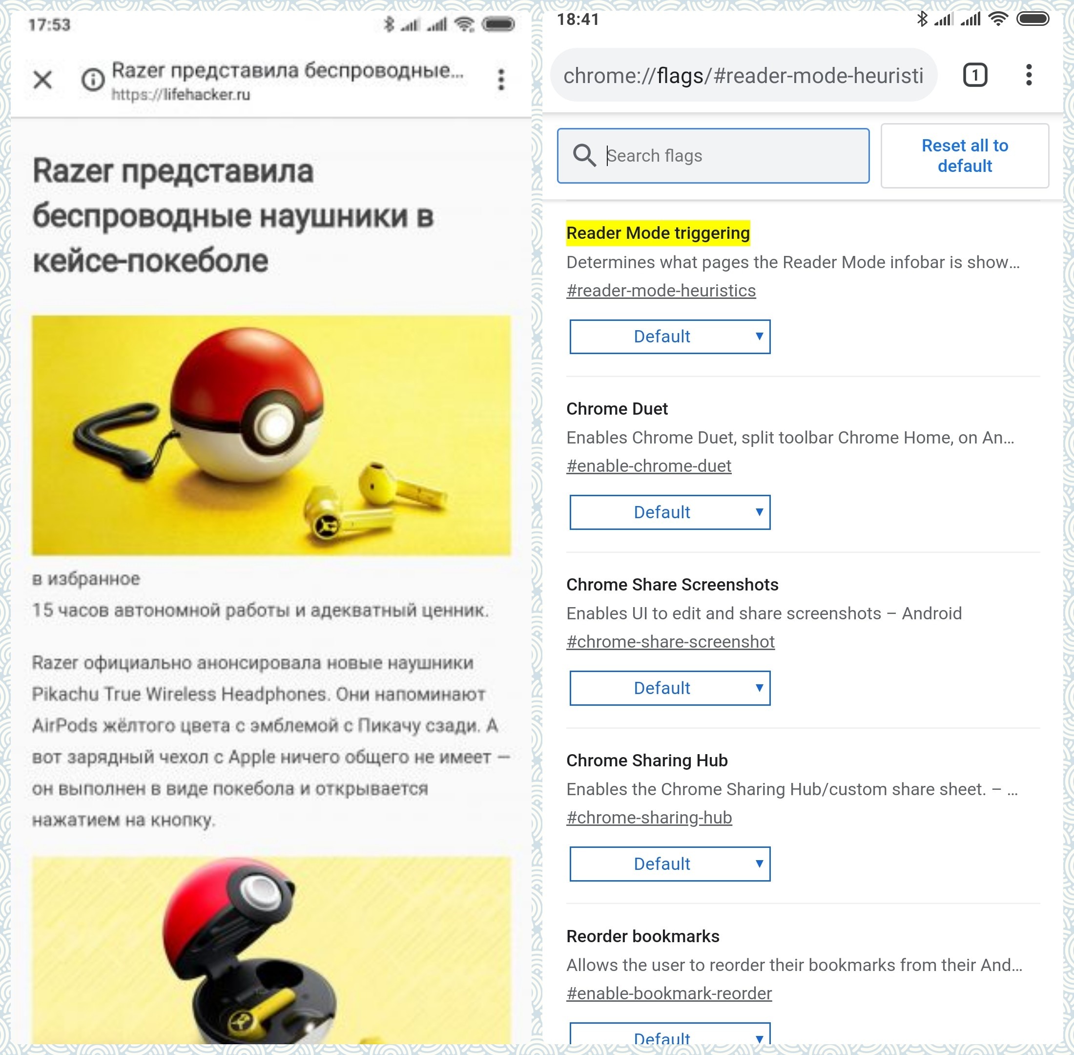 В Chrome есть очень удобный режим чтения, который открывается нажатием на всплывающую кнопку «Упрощённый просмотр» К сожалению, кнопка эта подчиняется какой-то своей, особой логике, и не появляется на доброй половине сайтов, в том числе и на нашем. Если переключите этот флаг в режим Always или All Articles, кнопка будет на виду всегда.