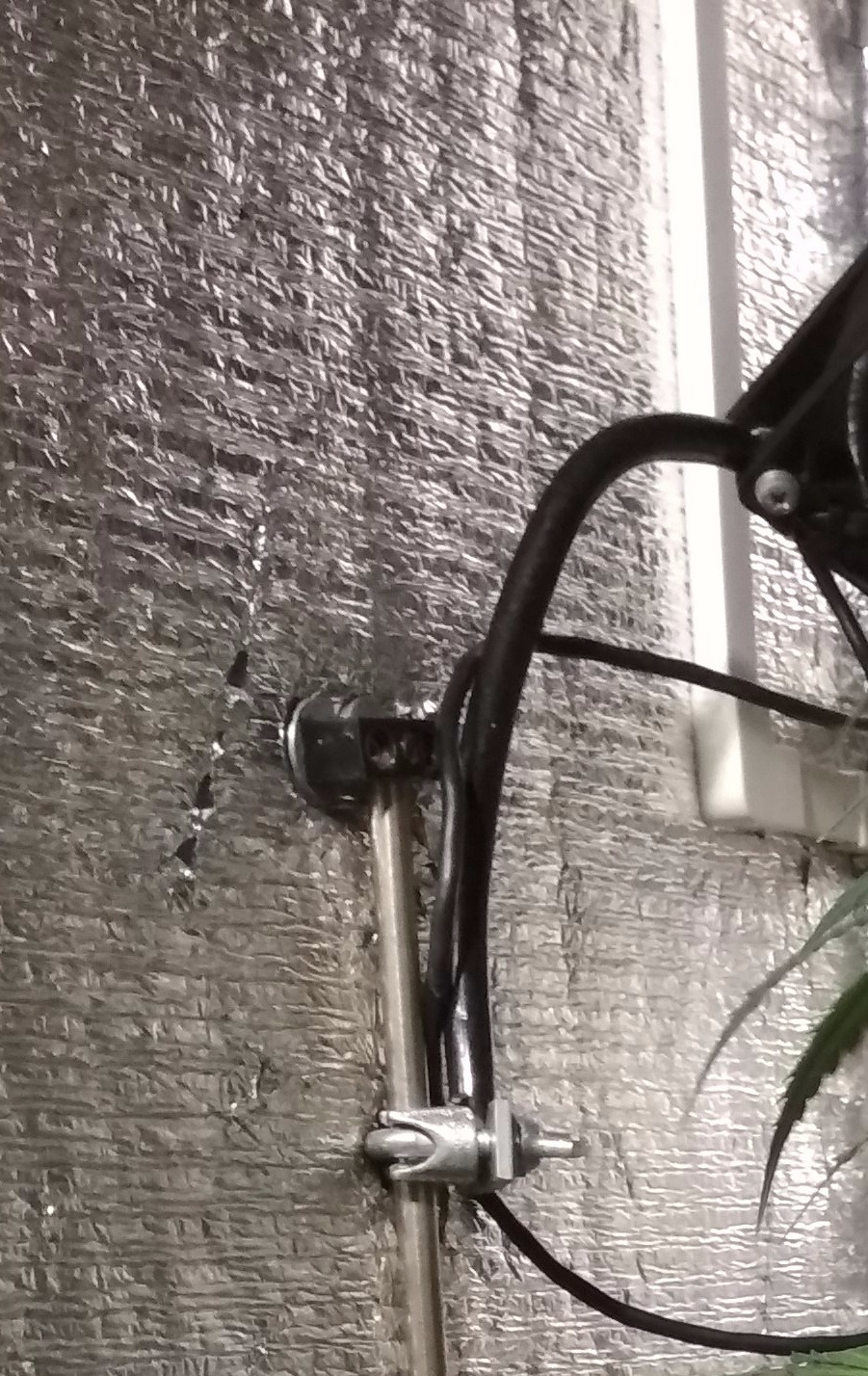 Там была приделана направляющая от старой, мебельной фурнитуры и к ней (через зажим для троса) был прикручен кусок стальной проволоки, к которой в свою очередь, был приделан корпусный "сто двадцатый" вентилятор. Получилось своеобразное крепления типа "гусиная шея". Но к палатке ж то я такую конструкцию не прикручу!! 😂