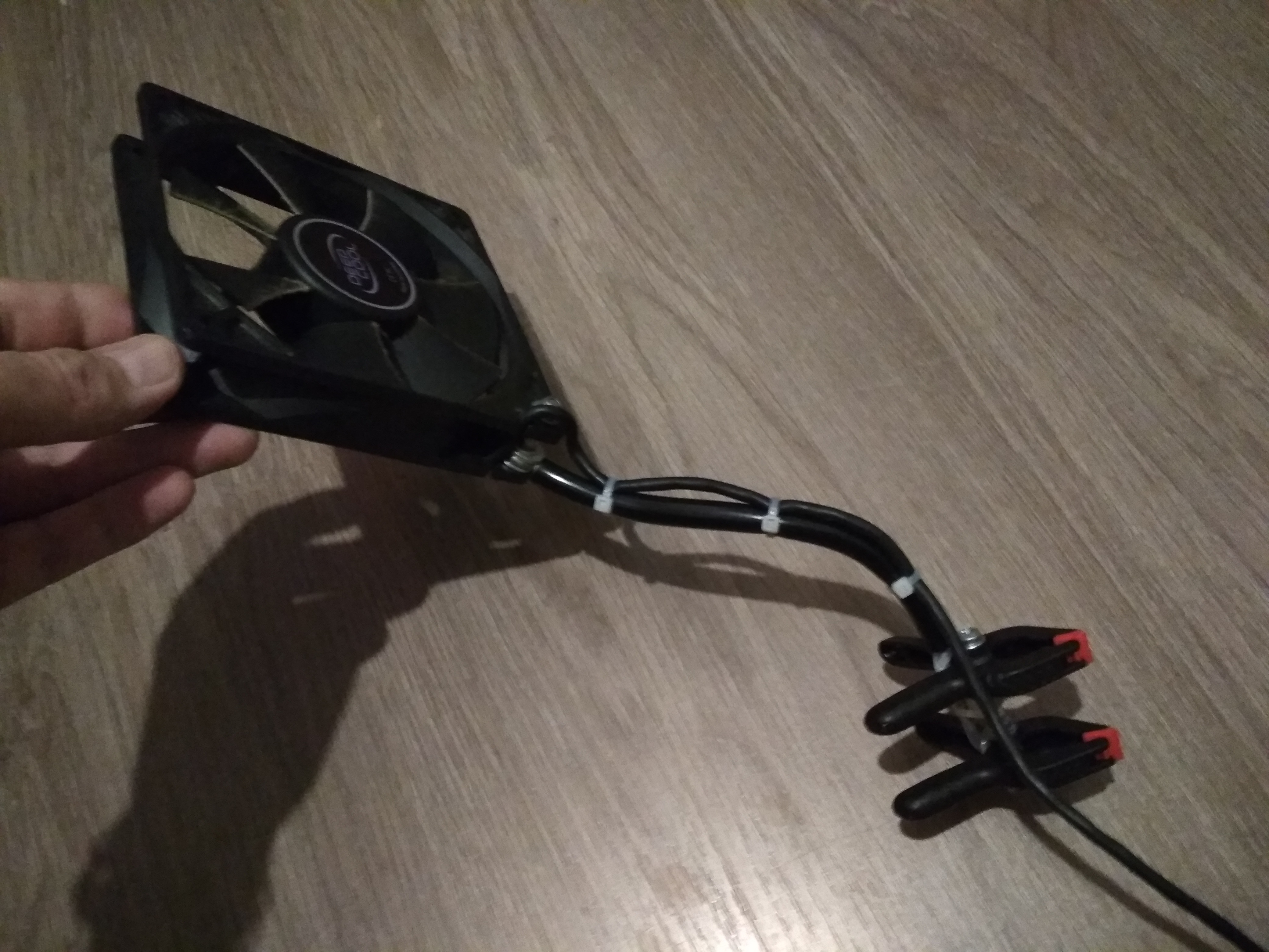 Потом используя пластиковые стяжки приделал (к уже двойной) струбцинке вентилятор и получился вот такой кулер-прищепка с гибким держателем.