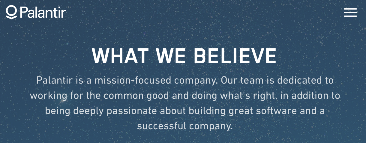 [...] There is the rub. Mr. Karp is eloquent on the subject of Palantir saving lives, but it is in business to make money — as are its eager investors. It actively seeks corporate contracts worth tens of millions, and is getting bigger by the day. People familiar with the company say it has big deals with insurers, health care companies and media corporations, among others. Its advisers include James Carville, the Democratic strategist; Condoleezza Rice, the former secretary of state; George J. Tenet, the former C.I.A. director; and Michael Ovitz, the former head of Disney Studios and Hollywood superagent.