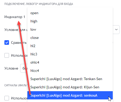 Индикатор 1 (в данном пример - линия senkouA) должен пересекать индикатор 2 (в данном пример - линия senkouB) вверх.
