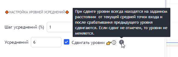 Во втором режиме работа стратегии по времени закрытия сделок является средним между лимитной сеткой и работой усреднений по сигналам со сдвигом: усреднения также происходят по сигналам, но расстояние от ТВХ до уровней не увеличивается.