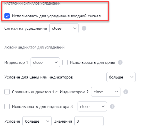 - по-умолчанию для усреднения используется входной сигнал с применением всех фильтров. Для подключения другого сигнала на усреднение необходимо использовать выбор индикатора или подключение любого индикатора. Любой сигнал в этом блоке НЕ фильтрует предыдущий индикатор для усреднения, а заменяет его.