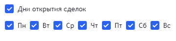 В процессе тестов заметил, что самые длинные сделки открываются в пятницу, а то и в четверг, а вот в воскресенье вполне можно открывать (для ТФ 5М-1М не существенно). В связи с этим ввел ограничение по дням недели.