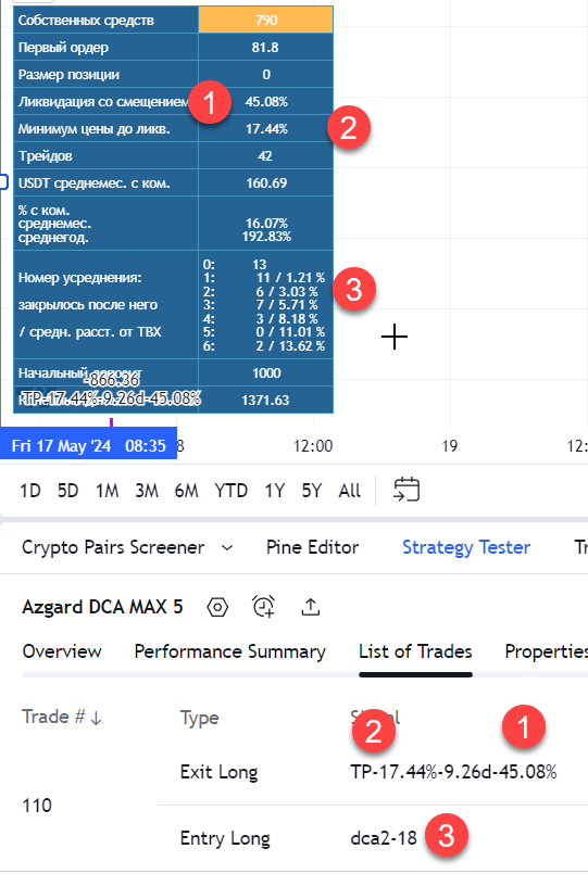 Соответственно в таблице данных также произошли изменения. Уровень ликвидации (2) показывается по итоговому значению ликвидации после срабатывания всех усреднений, поэтому теперь называется "со смещением". Минимум цены до ликвидации (3), на который приближается цена в процессе незакрытого трейда, также показывается с учетом смещения цены ликвидации.