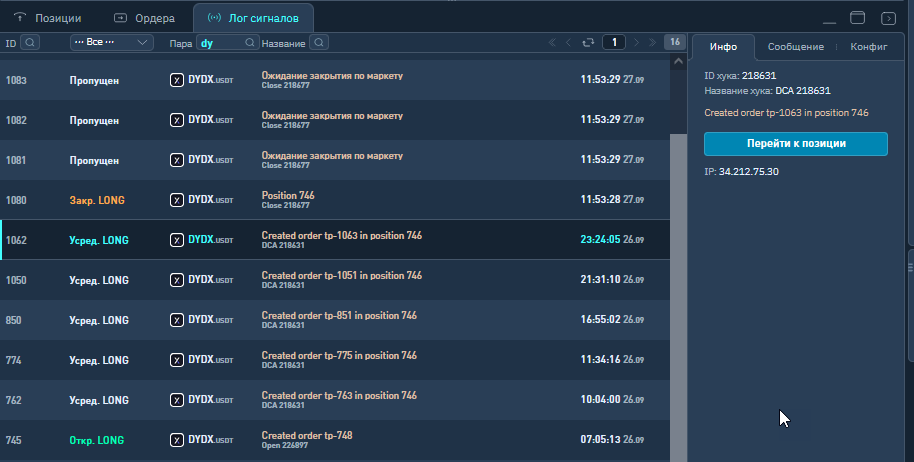 В логах веб-хуков видно их название. Пропущенные сигналы - это сигналы закрытия по ТП нескольких ордеров из бэктеста - их Finandy не обрабатывает, потому что в настройках вебхука на закрытие стоит "закрыть всю позицию", что происходит при первом сигнале от TV.