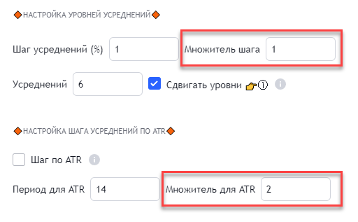 1. Улучшена работа настройки шага усреднений по АТР (динамической сетки): при выходе последних ордеров в область отрицательных значений - если настройки ATR и шага уровней усреднений слишком большие - они не отображаются и не вызывают ошибок по ликвидации. Настройки, которые могут привести к такой ситуации, выделены на рисунке ниже