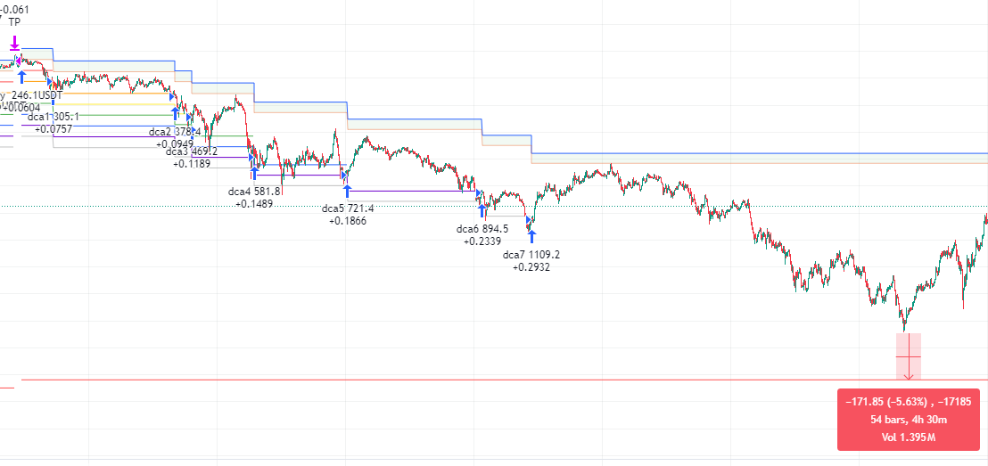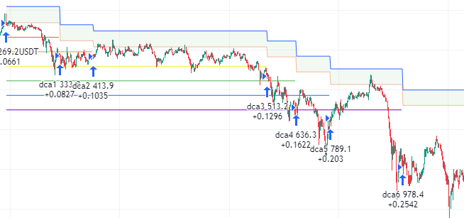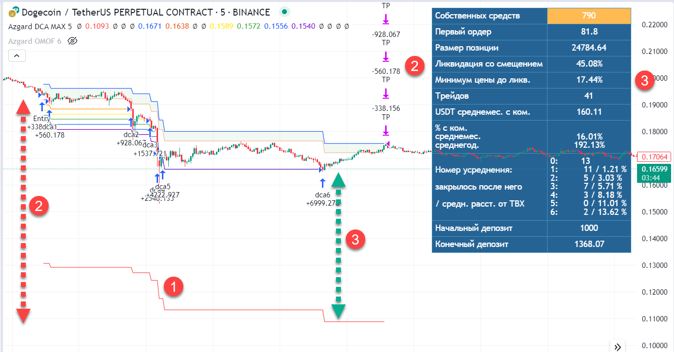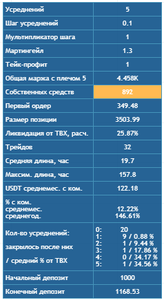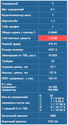 По истории сделок мы видим, что максимальное расстояние от точки входа до ликвидации составляло 64,8%, а цена приближалась к ликвидации максимум на половину этого расстояния - 31%. Также видно, сколько раз срабатывали усреднения 1, 2 и 3.