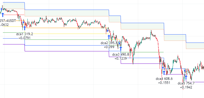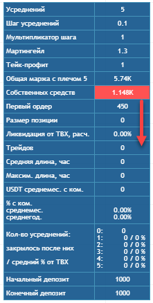 Как и в прошлых версиях, цена ликвидации считается от всей позиции, которая может быть набрана при срабатывании всех усреднений. Но так как в отличие от лимитной сетки мы не можем узнать среднюю цену входа, теперь цена ликвидации корректируется при срабатывании усреднений (1)