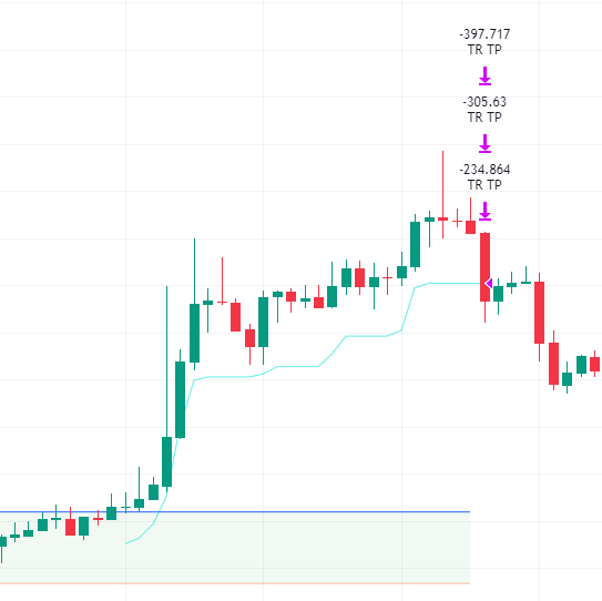 При закрытии свечи выше ТП начинает отслеживаться пересечение вниз уровня трейл-тейка, при пересечении сделка закрывается.