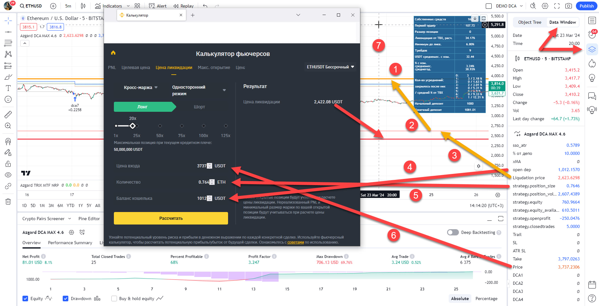 (1) До начала торговли цена ликвидации (2) считается для точки входа, которая соответствует теоретическому случаю, когда все уровни срабатывают, как лимитные ордера (3). И мы имеем размер депозита при открытии сделки (4). После срабатывания всех усреднений мы имеем позицию (5) и реальную цену входа (6) на момент (7) - положение перекрестия-курсора на незакрытой сделке - после срабатывания всех усреднений, которые и должны подставить в калькулятор.