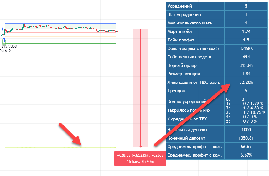 Однако в отличие от сеточного бота, в котором жестко зафиксированы цены, по которым будет произведена закупка заранее известного объема, в DCA это не известно, поэтому точно посчитать цену ликвидации невозможно.