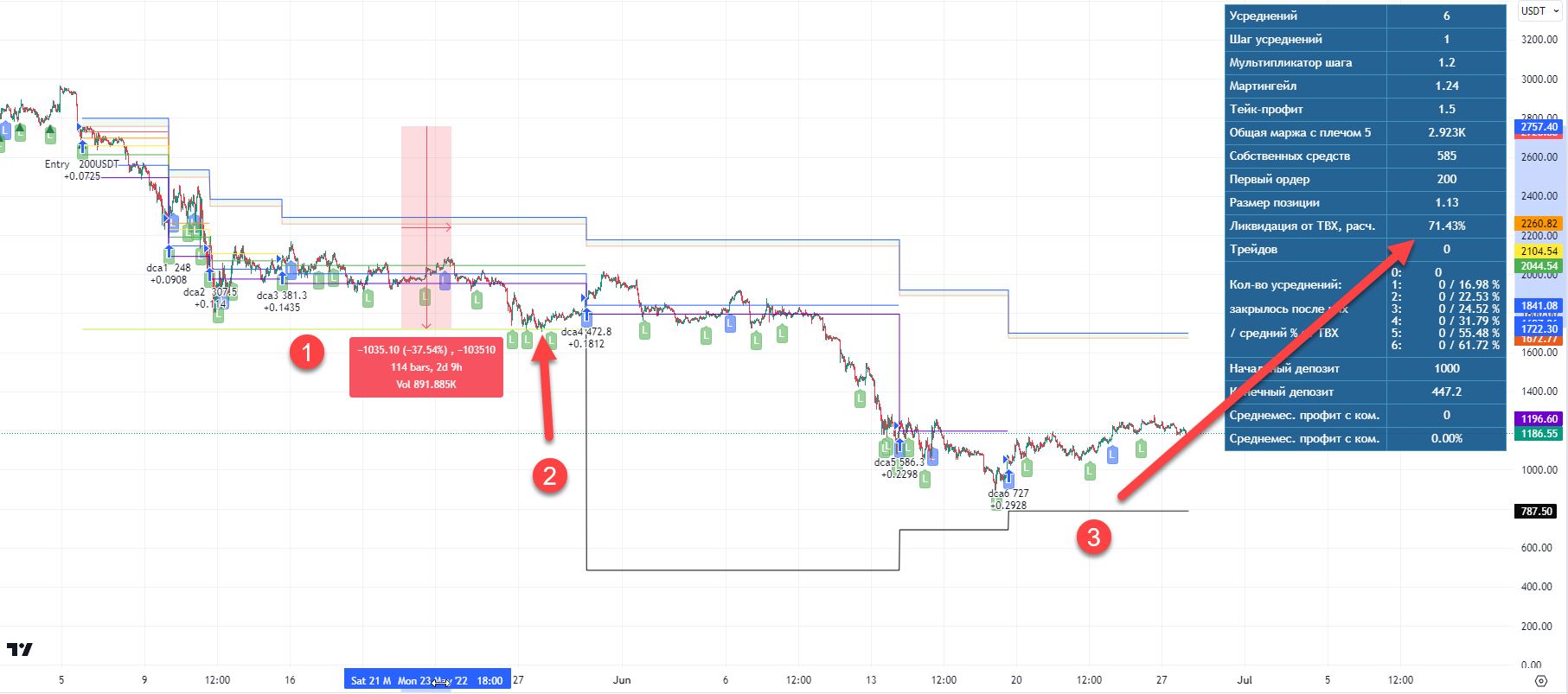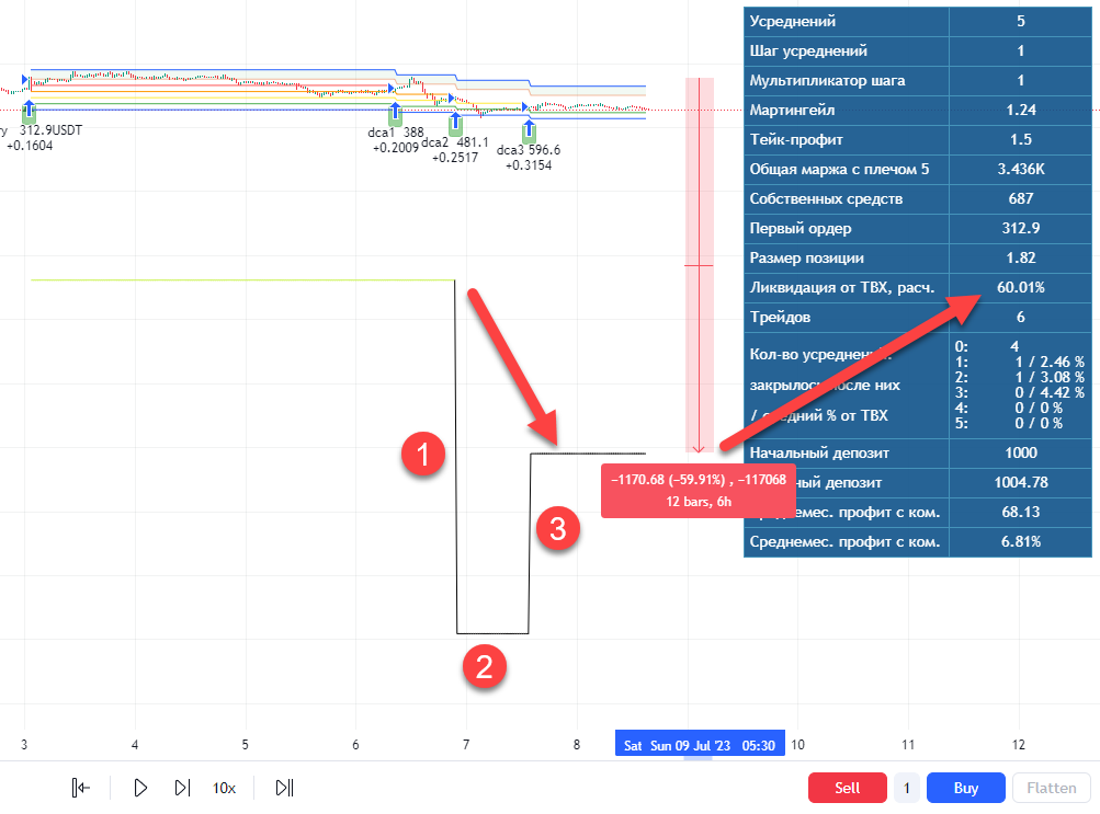 В момент второго усреднения (1) позиция стала достаточной для появления ликвидации и расчетная линия опустилась до реального значения (2). При срабатывании третьего усреднения ликвидация поднялась до нового значения (3) и расстояние от ТВХ составило 60%.