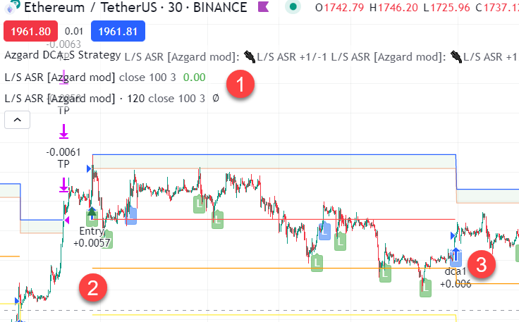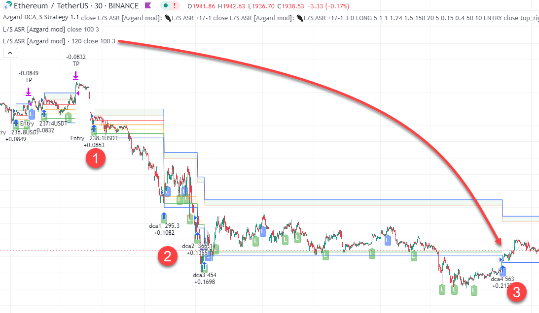В данном описании бэктест настроен на один индикатор, но на две его копии (1), одна из которых работает на вход в сделку на ТФ 30М (2, зеленый сигнал), а вторая - на усреднение на ТФ 2Н (3, синий сигнал)