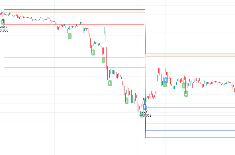 После этого сетка уровней срабатывания сигналов на усреднение ПЕРЕДВИГАЕТСЯ таким образом, чтобы между ценой закупки и следующим уровнем было расстояние, рассчитанное в настройках сетки.