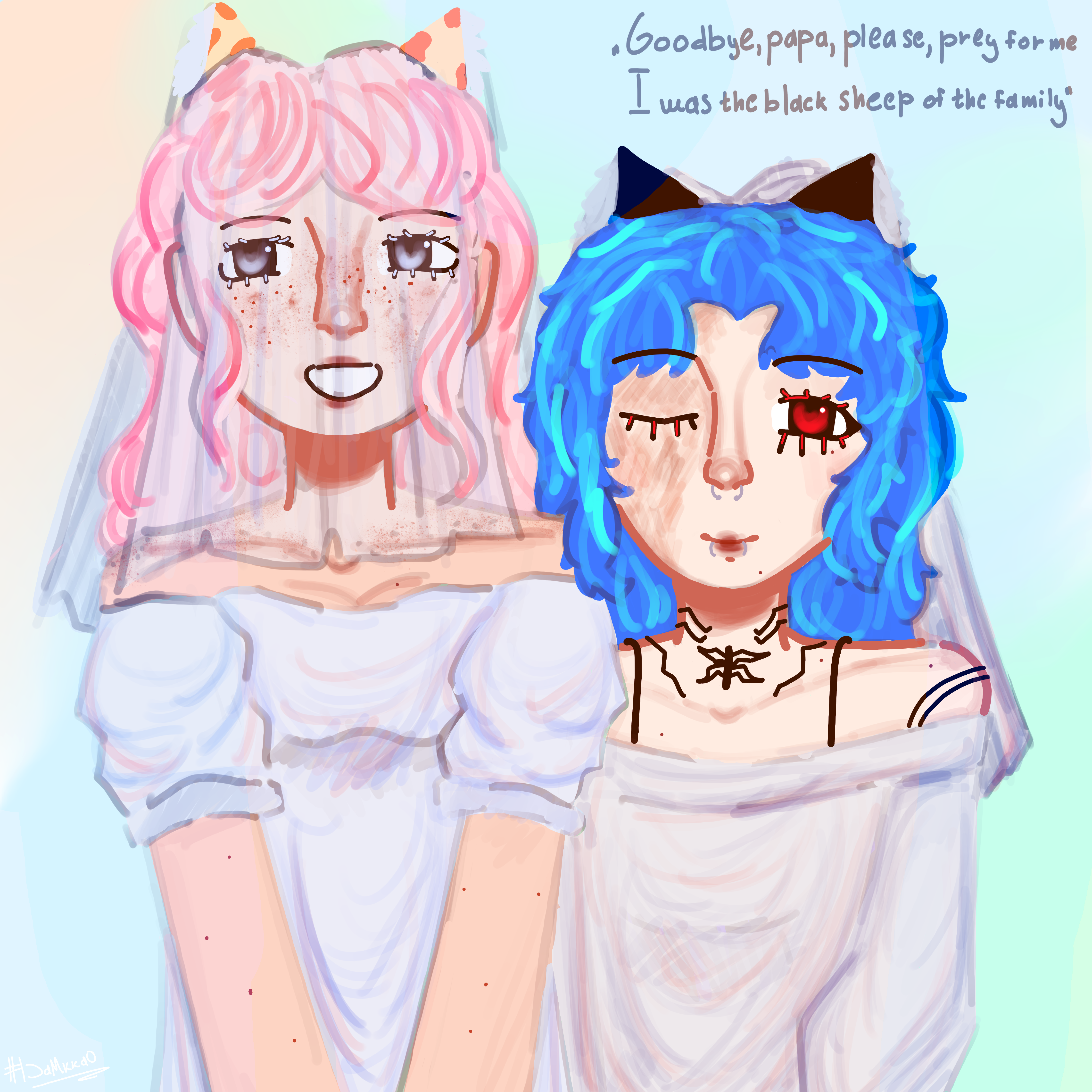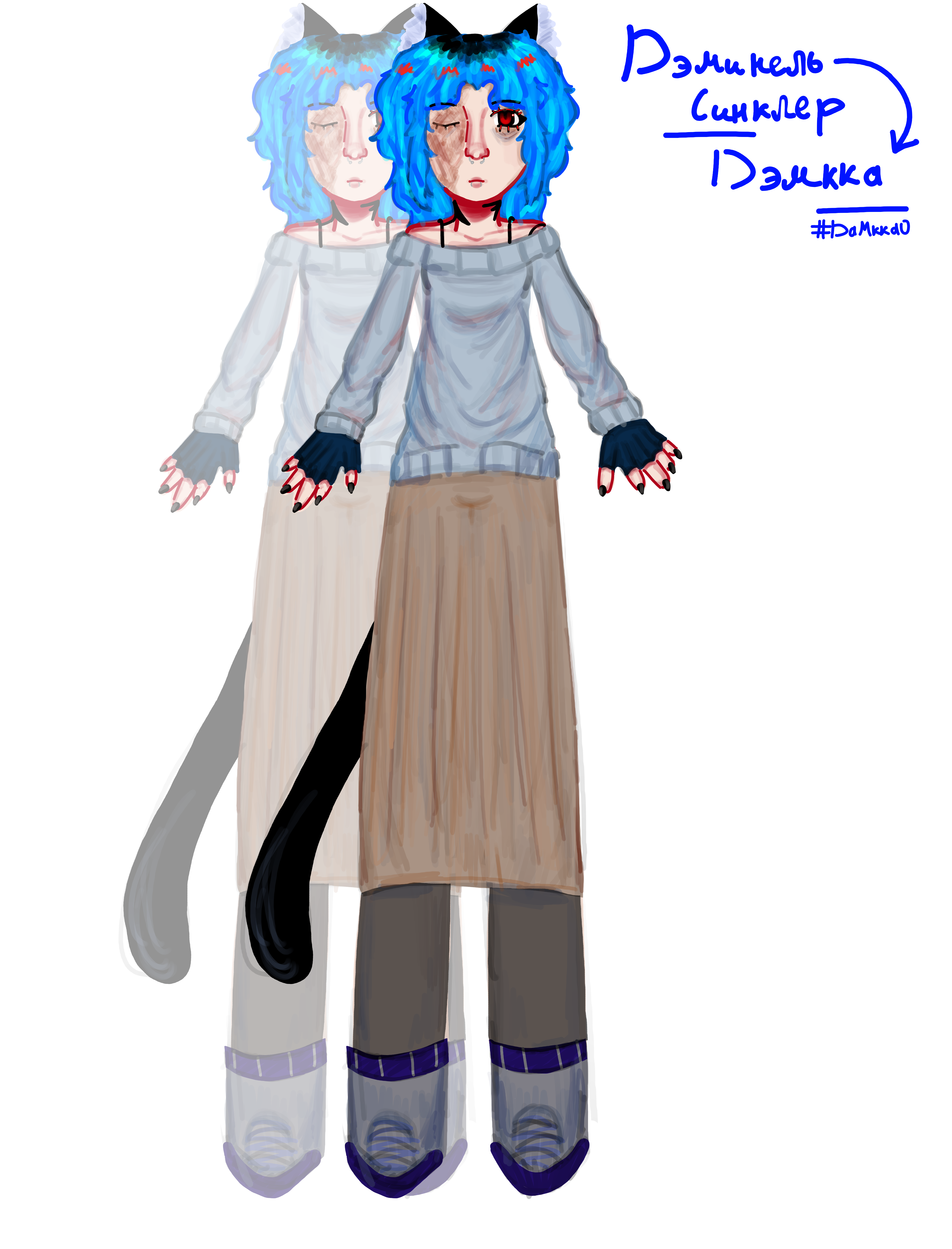 в итоге, спустя два года дэмкка раскрыла глаза и сама ушла от Дани. по началу она долго убивалась по нему, страдая, и мечтая вернуть всё то, что было между ними. но позже её внимание переключилось на другую девушку. Янь. она добрая, заботливая, всегда была рядом и знала о всё о Неле. и дэминель поняла, что даню она никогда и не любила. а вот на Янь частенько засматривалась, могла часами разговаривать с ней. тем более Янь как и Дэмкка - гибрид кошки и человека. они были похожи больше, чем думали. и в конце концов начали встречаться. закончили университет, с помощью родителей Янь и собственных накоплений смогли купит, пускай и небольшую, но свою квартиру. а через какое-то время дэмкка сделала предложение и Янь ответила да.