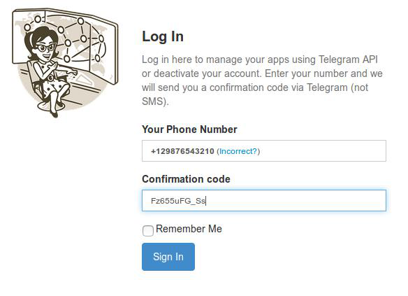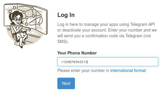 1: اذهب إلى https://telegram.org/deactivate واكتب رقمك بالصيغة الدولية +(كود دولتك)(رمز مدينتك أو مزود الاتصالات لديك)(رقمك) دون أي مسافات أو فواصل ثم اضغط على زر Next.