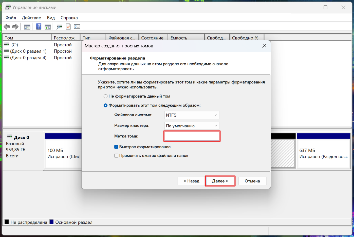 Совет: метку тома я обычно стираю, чтобы диск назывался «Локальный диск...», либо же вы можете вставить туда свой название