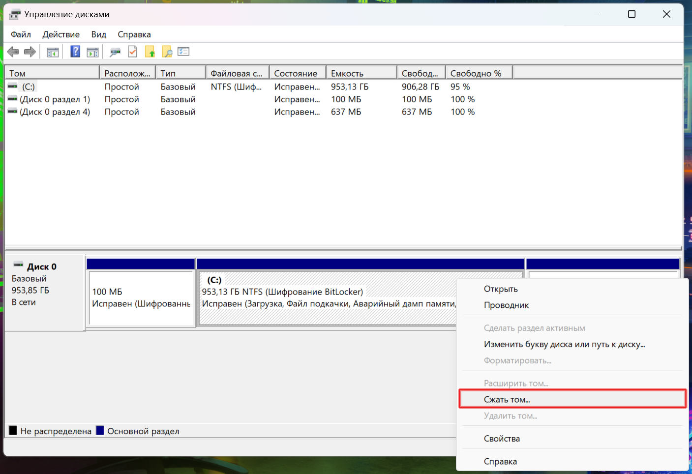 2. Здесь нажмите правой кнопкой мыши по разделу, который вы хотите разделить, и выберите пункт «Сжать том...»