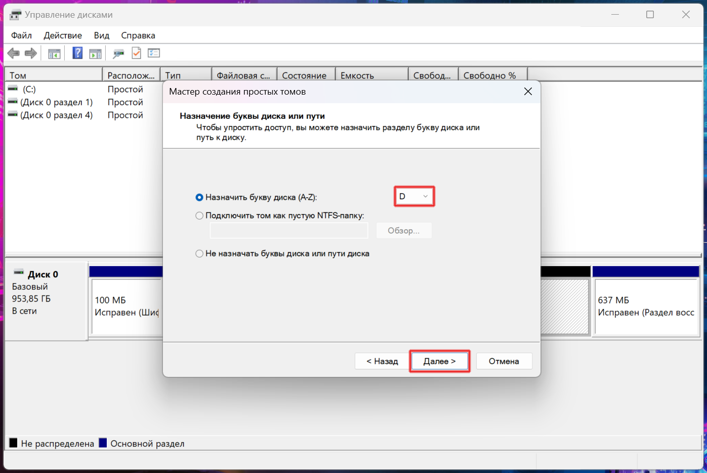5. Введите размер тома, выберите букву (у меня D), остальное можете оставить по умолчанию