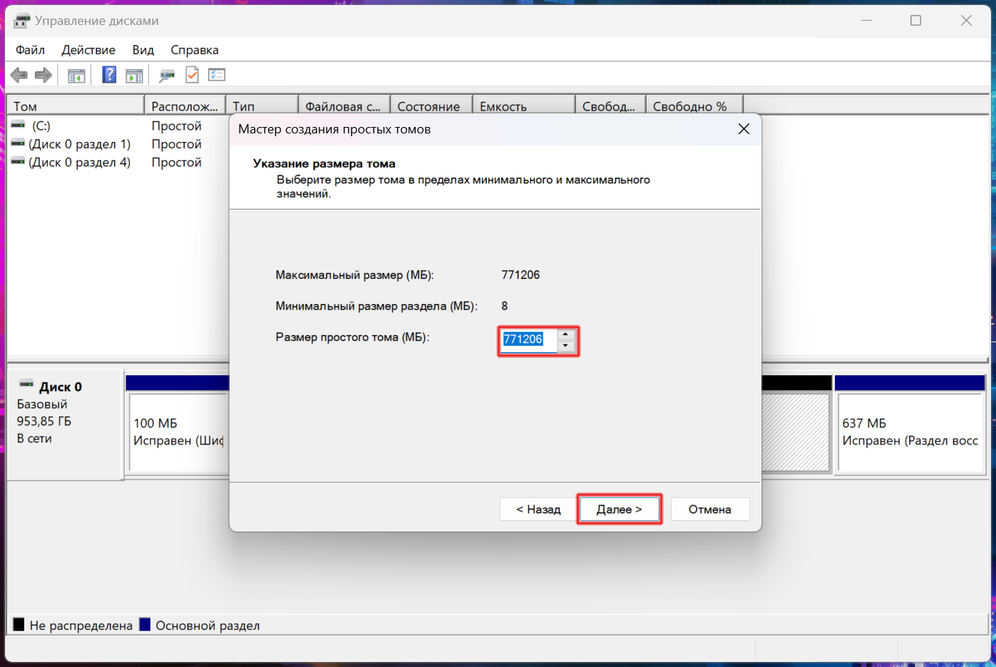 3. В этом меню введите размер нового тома, который хотите создать, и продолжите