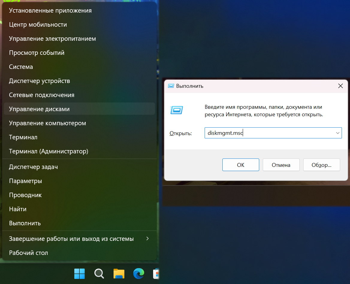 1. Откройте приложение «Управление дисками»: нажмите правой кнопкой по иконке пуск и выберите соответствующий пункт, либо откройте окошко «Выполнить» (Win+R) и введите
