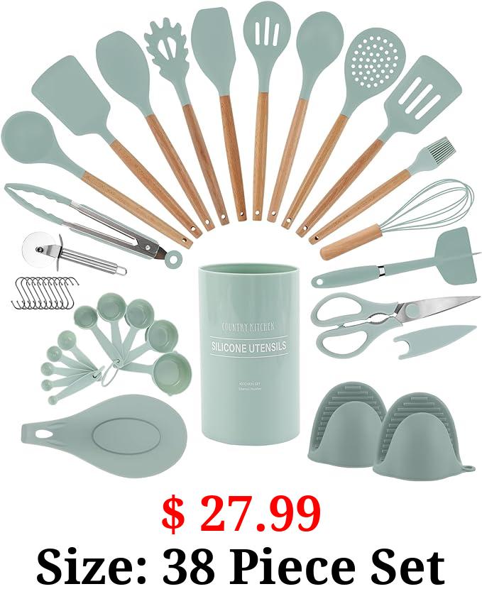 $ 27.99 Size: 38 Piece Set Country Kitchen Cooking Utensils Set - 38 pcs Non-stick Silicone Spatula Set with Holder, Wooden Handles and Heat Resistant Gadgets Utensil