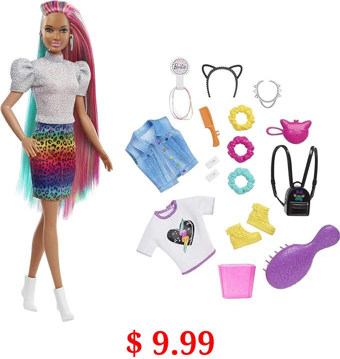 $ 9.99 Barbie Doll Leopard Rainbow Hair Brunette With Color-Change Highlights & 16 Styling Accessories Including Clothes, Scrunchies, Brush & More
