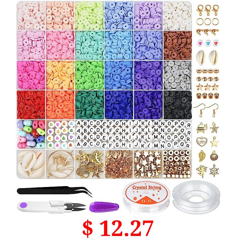 $ 12.27 Gionlion 6000 Pcs Clay Beads for Bracelet Making, 24 Colors Flat Round Polymer Clay Beads 6mm Spacer Heishi Beads with Charms and Elastic Strings for Jewelry Making Kit Preppy Bracelets