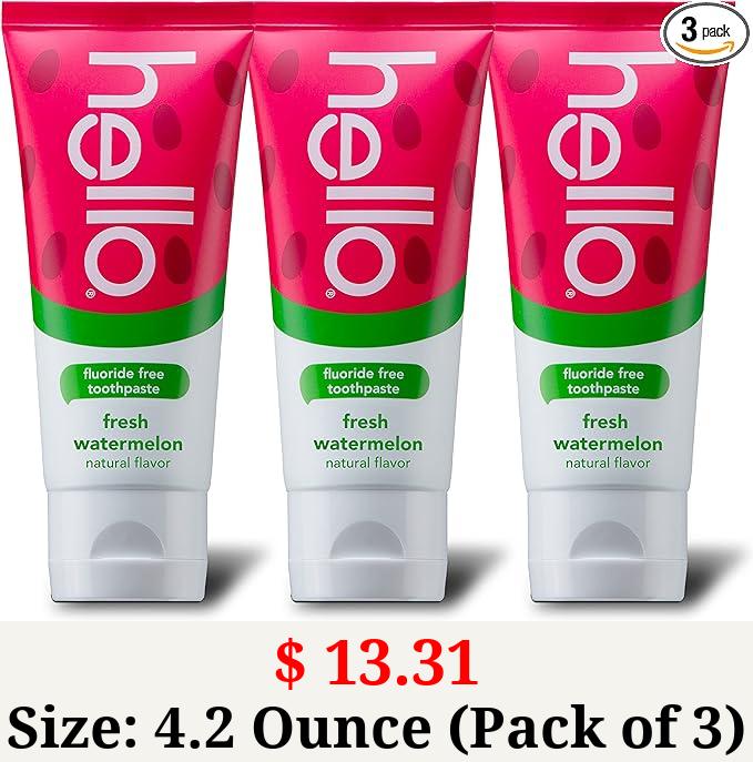 $ 13.31 Size: 4.2 Ounce (Pack of 3) Hello Natural Watermelon Flavor Baby & Kids Fluoride Free Toothpaste, Vegan, SLS Free, Gluten Free, Safe to Swallow for Baby and Toddlers, 4.2 Ounce. 3 Pack