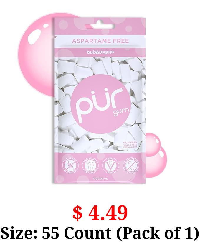$ 4.49 Size: 55 Count (Pack of 1) PUR Gum | Aspartame Free Chewing Gum | 100% Xylitol | Sugar Free, Vegan, Gluten Free & Keto Friendly | Natural Bubblegum Flavored Gum, 55 Pieces (Pack of 1)