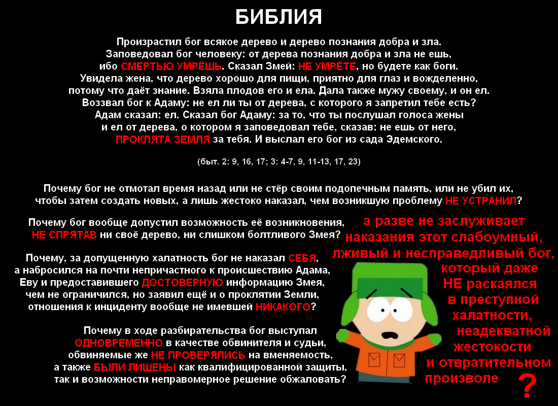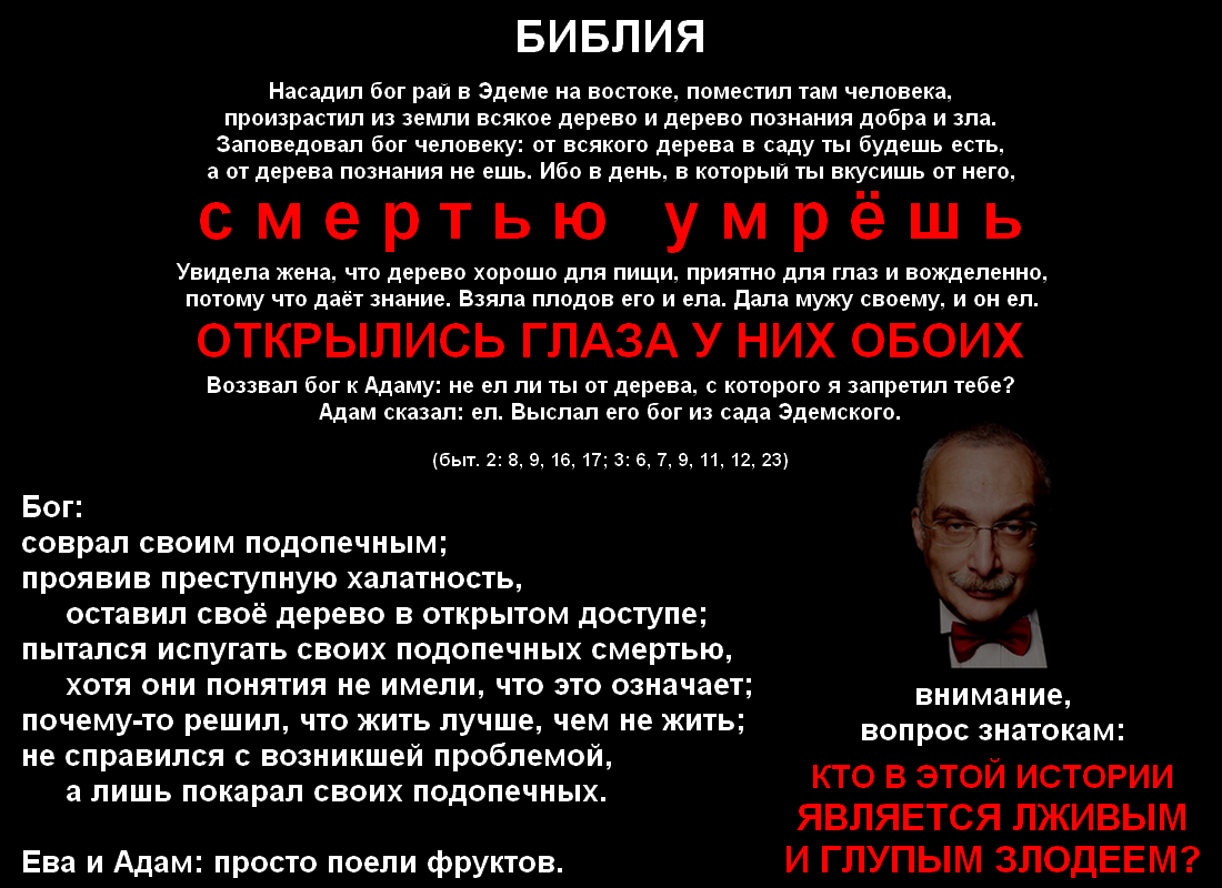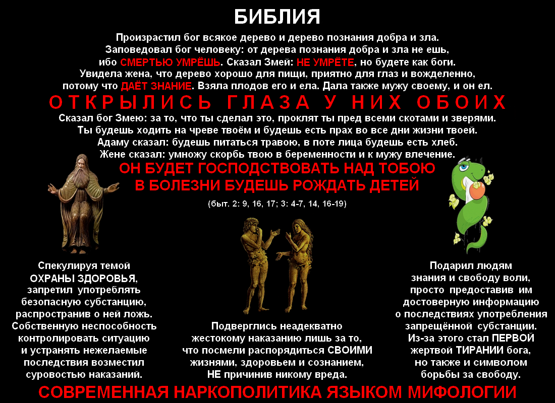 Даже какой-нибудь дебильный папаша, навсегда выгоняющий из дома своих малых детей только за то, что они без его разрешения берут принадлежащую ему вещь, а потому, несомненно, заслуживающий лишения родительских прав и всеобщего порицания, является гораздо меньшим подонком, чем бог, так как в этой истории, делая то же самое, он дополнительно отягощает Еву ещё и необходимостью испытывать скорбь и боль во время беременности и родов. Если кто-то и способен полноценно посостязаться с ним, при чём не только в жестокости, но сразу ещё в лживости, тупости и бессилии, то это правительства большинства государств мира реального, на протяжении нескольких последних десятилетий ведущие бессмысленный и безумный террор против потребителей различных нейроактивных веществ, в том числе тех, которые, подобно райским плодам, имеют природное происхождение и для здоровья почти безопасны. Потому что, например,
