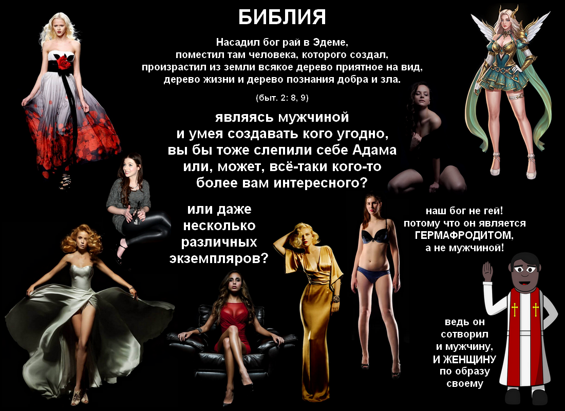 Напоследок необходимо ещё отметить, что если бог является мужчиной, то выглядит он слишком гомосексуально. Потому что, обладая уникальной способностью воплощать в жизнь свои самые изощрённые фантазии, о чём читателям известно из истории про создание Земли, садовника в собственный персональный рай он мастерит в облике мужика абсолютно банального, интеллектуально неполноценного, зато сверкающего голой жопой и прочими выставленными на обозрение прелестями, в то время как практически любой половозрелый гетеросексуал в аналогичной ситуации слепил бы себе "из праха земного" девочку с идеальной внешностью, при чём, скорее всего, даже не одну. Даже если такой выбор бога и объясняется как-то ещё, помимо наличия у него влечения к мужчинам, на подобии Адама, то совсем неубедительно. Он и "жену" то создаёт чуть позже ему, но не себе, при чём в качестве какого-то странного "помощника", а не объекта для реализации эротических фантазий, на что указывает, как уже было отмечено выше, даже строение её тела, далёкое от совершенства и стандартам полноценного рая, конечно же, несоответствующее. Но является ли бог мужчиной, уверенно сказать невозможно, так как ни прямых утверждений авторов об этом, ни хотя бы каких-то сведений, позволяющих читателям его половую принадлежность безошибочно установить самостоятельно, в тексте не содержится. А вот в качестве доказательства обратного присутствующая в истории про создание Земли фраза "сотворил бог человека по образу своему, мужчину и женщину" подходит вполне, так как указывает на его гермафродитизм. Гомосексуальность же определяется, как влечение одних представителей животного мира к другим, имеющим половую принадлежность, с их собственной совпадающую.