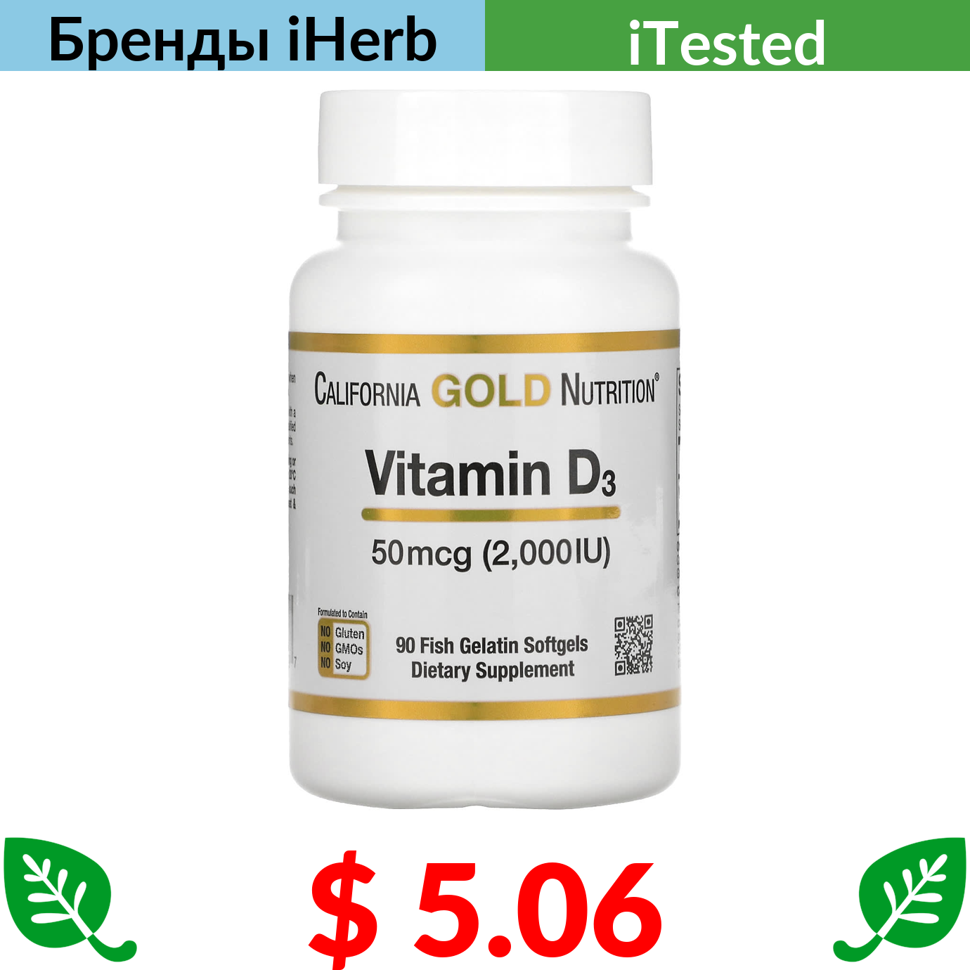 $ 5.06 California Gold Nutrition, витамин D3, 50 мкг (2000 МЕ), 90 рыбно-желатиновых капсул