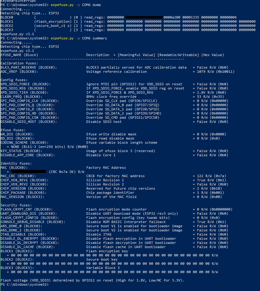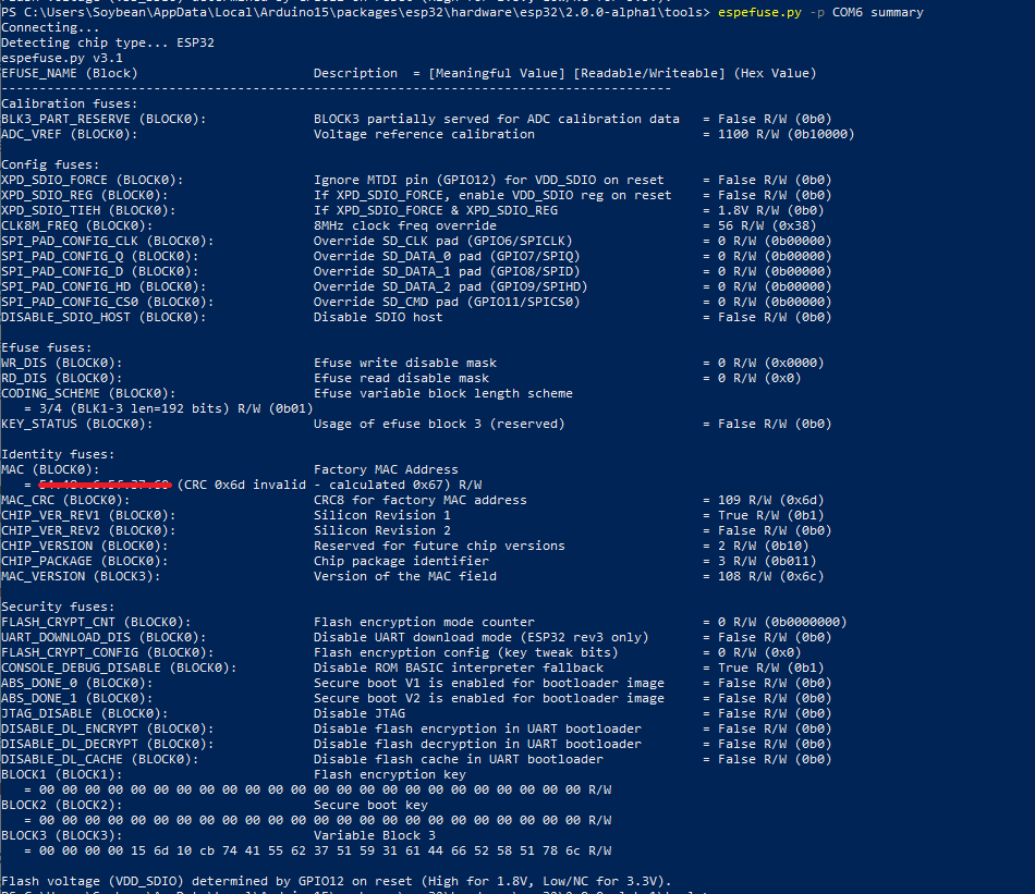 GG,还是不能启动,ESP32 的 bootloader 是闭源的,检测到 MAC CRC 错误直接拒绝启动。回头看了眼 efuse,MAC CRC 的确是错的,什么鬼,赶紧把备份的原厂固件刷回去……刷回去一切正常????等等,ESP 的芯片的 MAC 和对应的 CRC 都是芯片出厂时写入的,为什么 CRC 会不对????