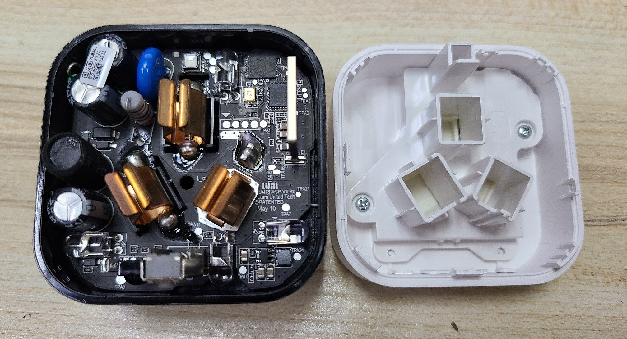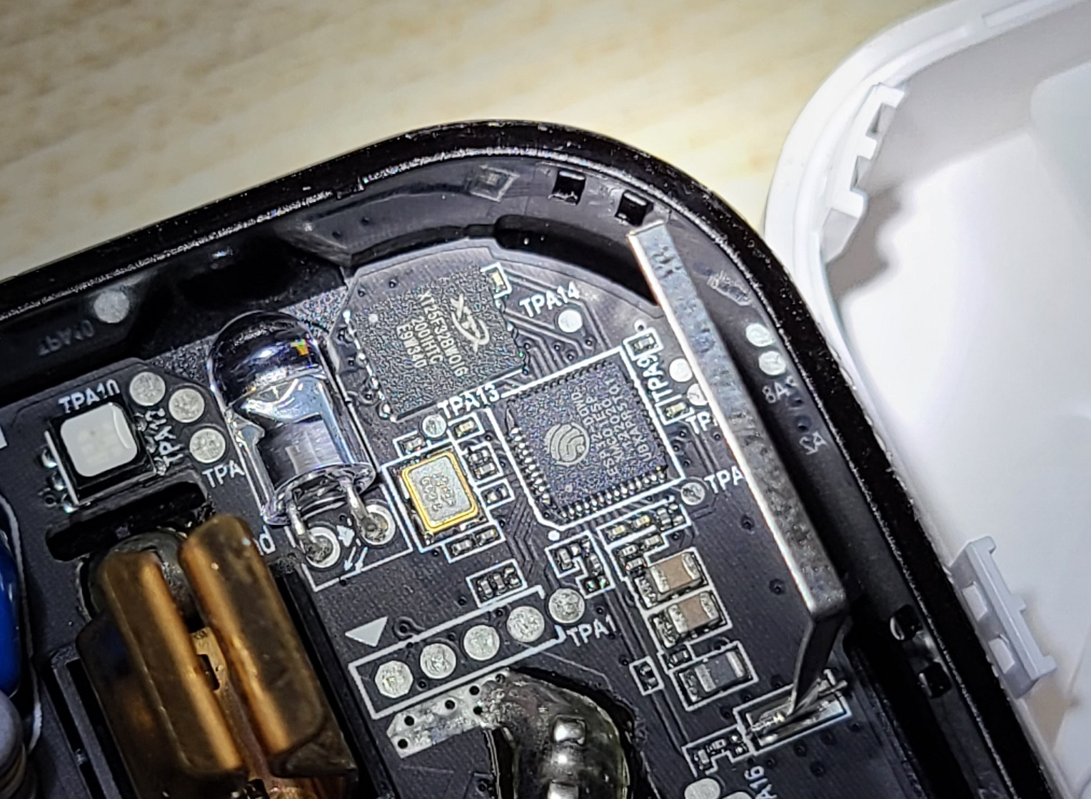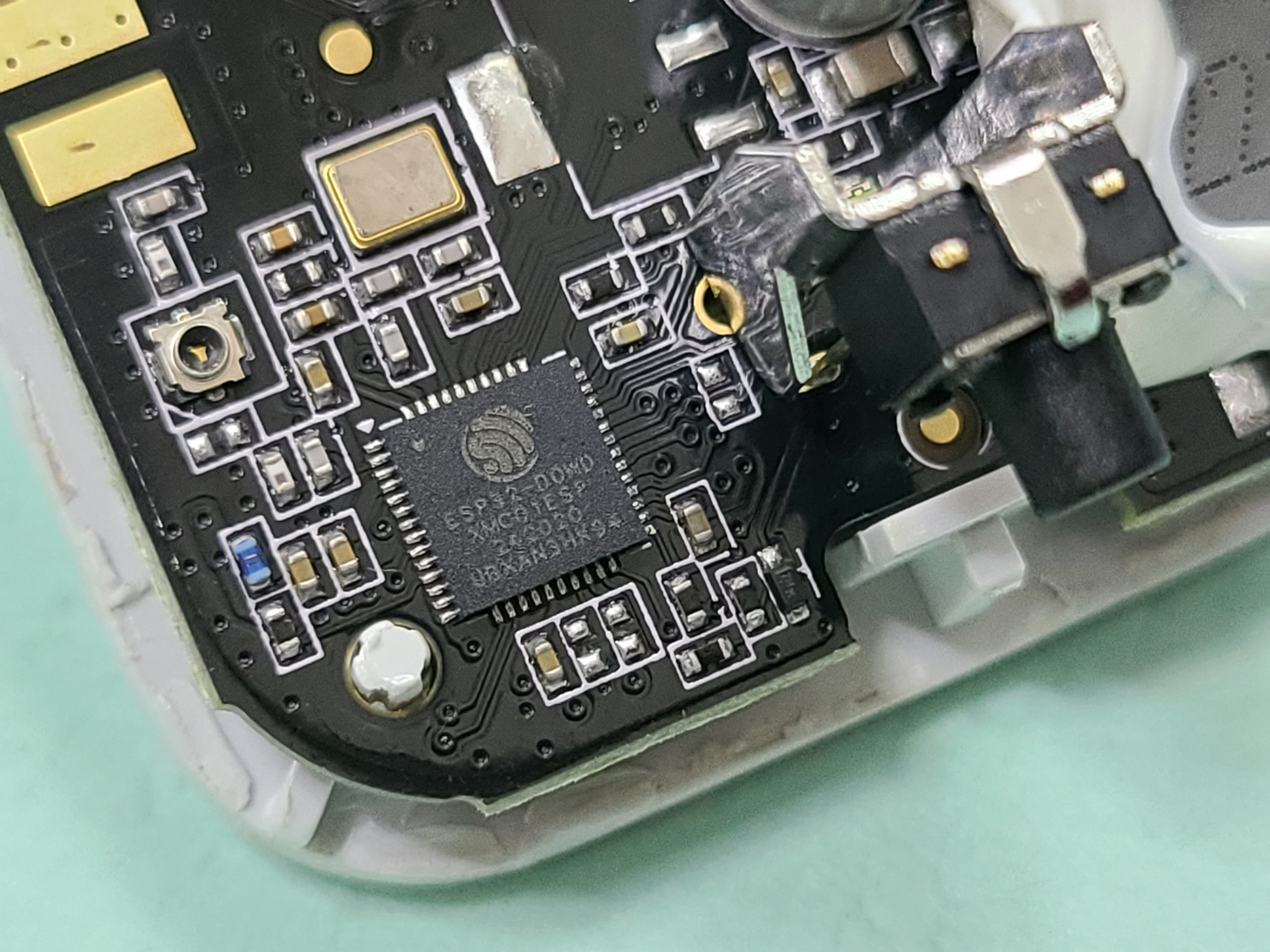 主控依然是小米定制版 ESP32。TPA1 是 UART,分别是 RX/TX/?/GND/?,开关不是 IO0,是 RGB LED 旁边的 TPA12。插脚焊点看起来比前面的 WiFi 开关焊得更死,就不再拆了。
