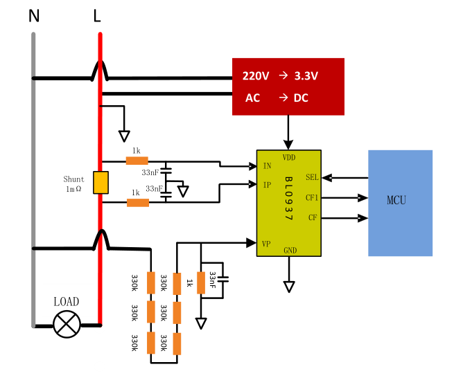 反面东西比较多:a. BL0937 功率计芯片,配合正面的 2mΩ 电阻测量实时功率;b. EON25QH32,4MB SPI Flash,存储固件代码;c:5V to 3.3V LDO;d. BP2525F 非隔离降压芯片,内置 500V 6.5Ω MOSFET。存储芯片下面还有 UART 的焊盘方便刷固件真好。拿万用表戳戳戳简单逆向了一下设计: