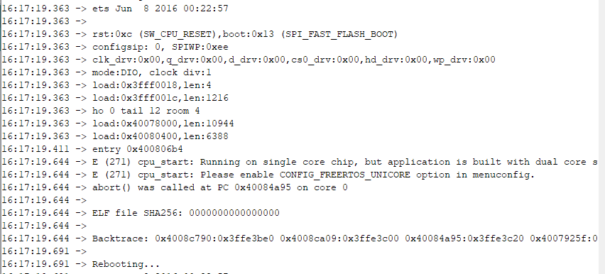 咦,开机报错,提示这是个单核 CPU? 明明确认过是 ESP32-D0WD的啊?检查下编译环境再看看: