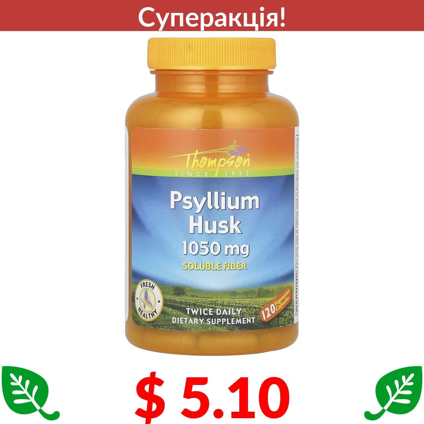$ 5.10 Thompson, Psyllium Husk, 1,050 mg , 120 Vegetarian Capsules (525 mg per Capsule)