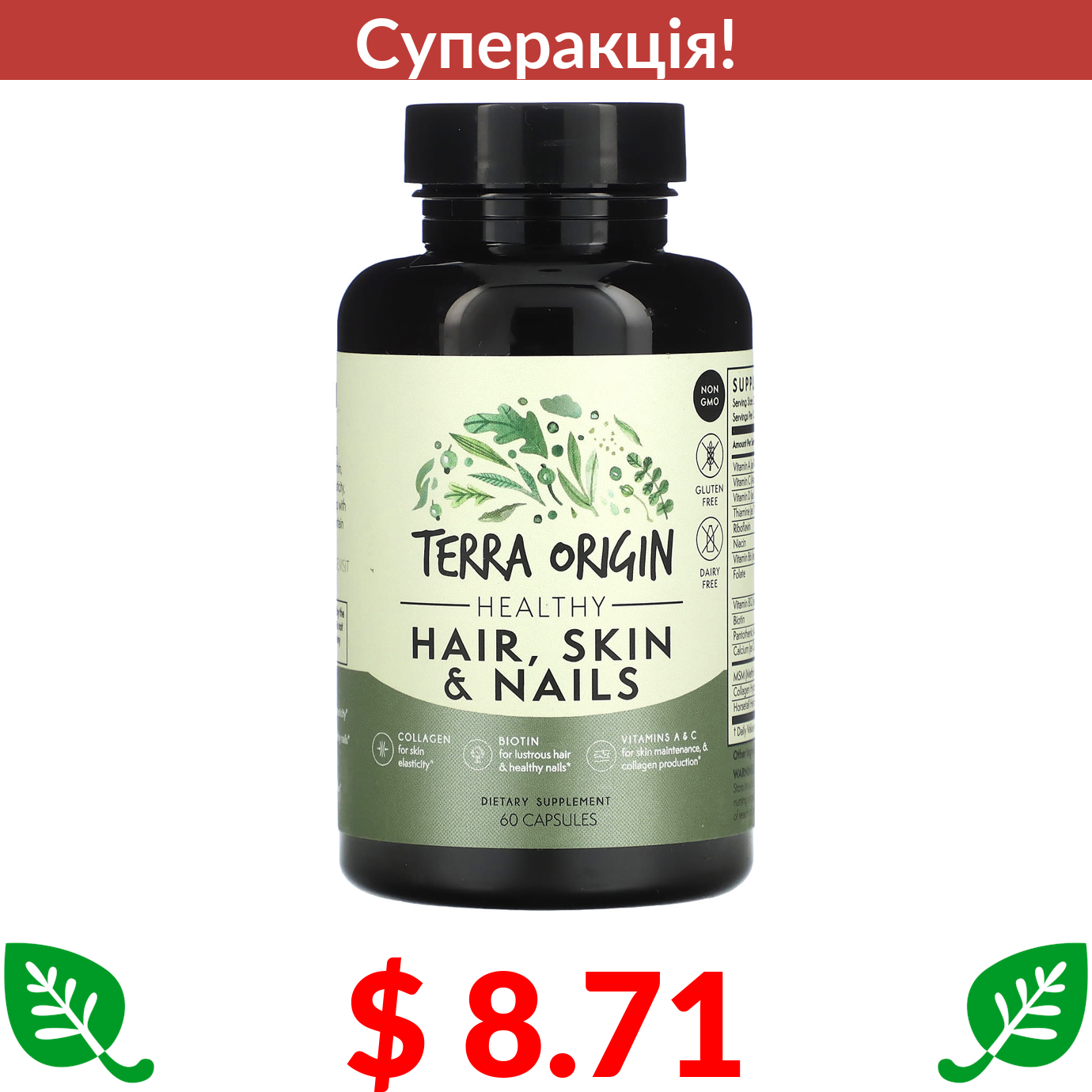$ 8.71 Terra Origin, добавка для здоров’я волосся, шкіри та нігтів, 60 капсул