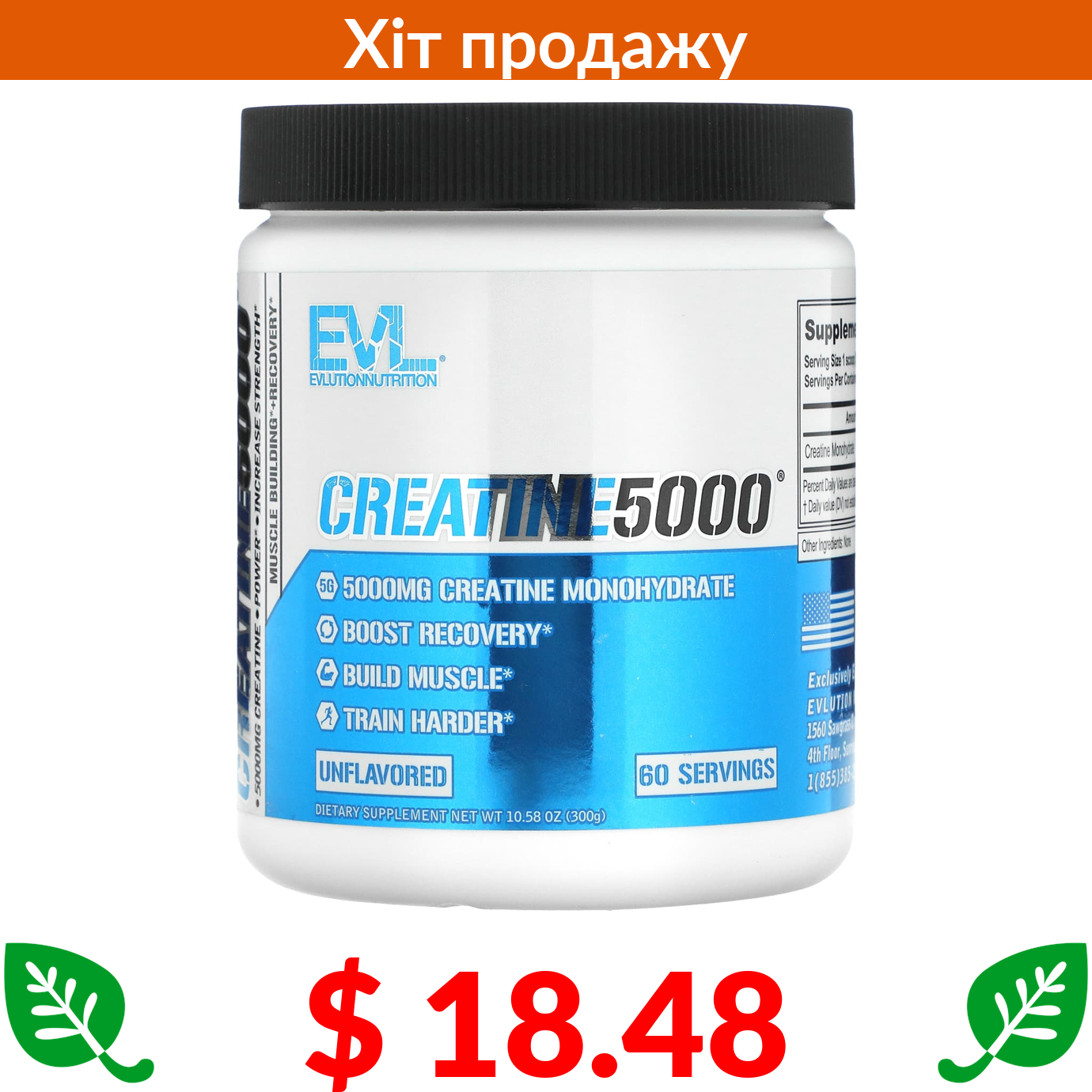 $ 18.48 EVLution Nutrition, CREATINE5000, креатин, без ароматизаторів, 300 г (10,58 унції)
