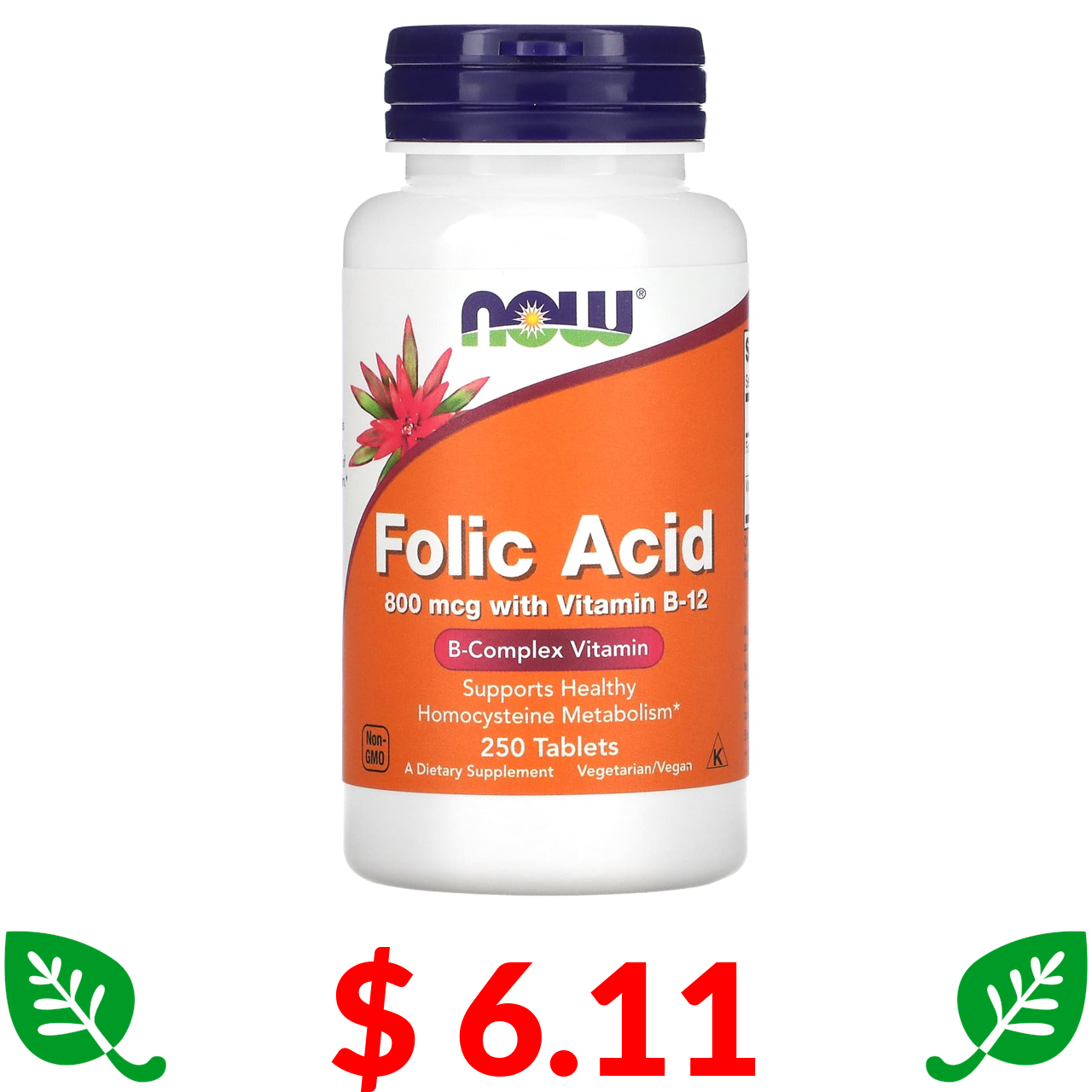 $ 6.11 Now Foods, фолієва кислота, 800 мкг, 250 таблеток