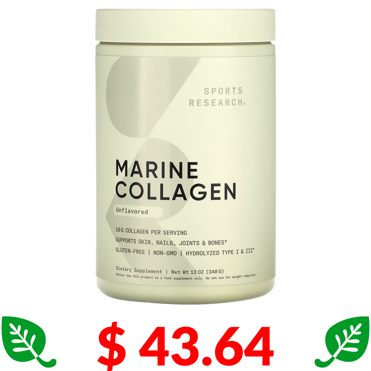 $ 43.64 Sports Research, пептиди морського колагену, з нейтральним смаком, 340 г (12 унцій)