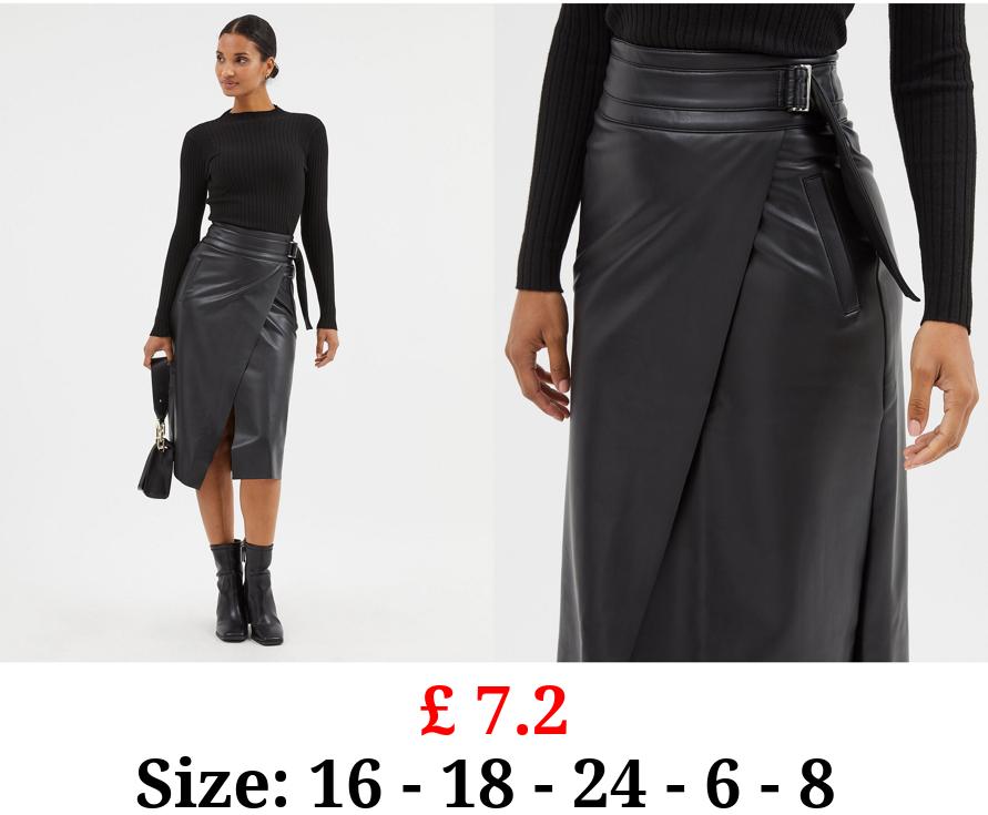 £ 7.2 Black Leather Look Wrap Midi Skirt