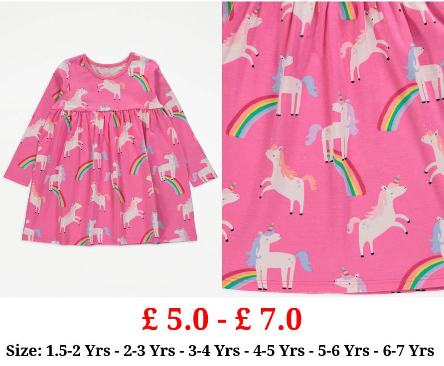 £ 5.0 - £ 7.0 Pink Unicorn Rainbow Print Long Sleeve Dress